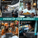 Multi-power ready — 12V/24V vehicle + 110V home/office