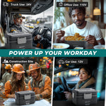 Multi-power ready — 12V/24V vehicle + 110V home/office