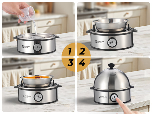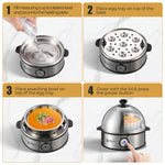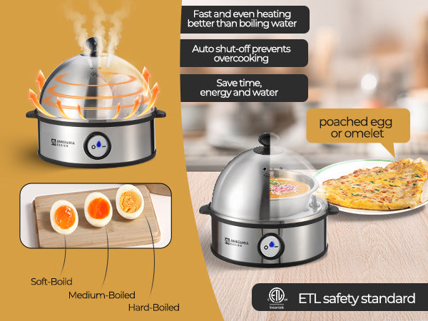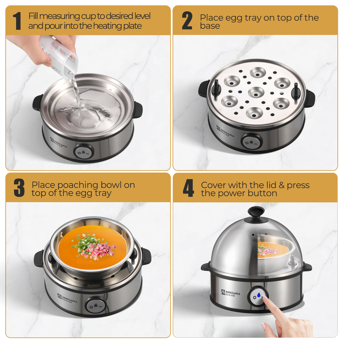 - VERSATILE EGG COOKER FOR EVERY OCCASION: Whether you're preparing breakfast for one or hosting a family gathering, the Annie & Mia Design egg cooker can cook boiled eggs, poached eggs, or omelets. It can even steam vegetables and Dim Sum.