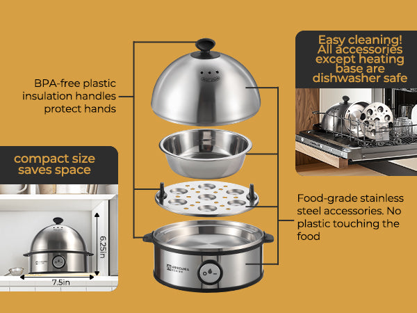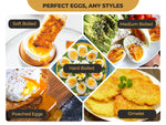 - PURE STAINLESS STEEL INSIDE & OUT: Lid, egg tray, poaching/omelet bowl, and heating plate are food-grade 304 steel, so nothing plastic ever touches your eggs for pure flavor and long-lasting durability. The BPA-free, heat-resistant grips let you lift the hot tray safely—no burned fingers, just quick serving or rinsing.