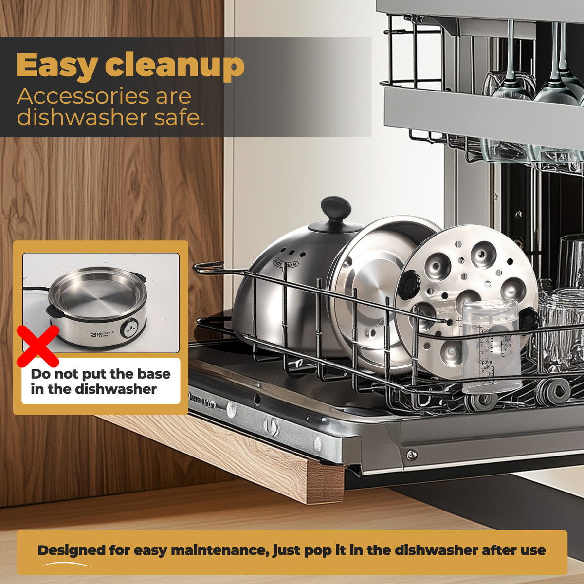 - HASSLE-FREE CLEANUP: Cleaning up this egg steamer is simple and quick! The detachable stainless steel lid, egg tray, and poaching/omelet bowl are dishwasher-safe. The heating plate can be wiped clean.