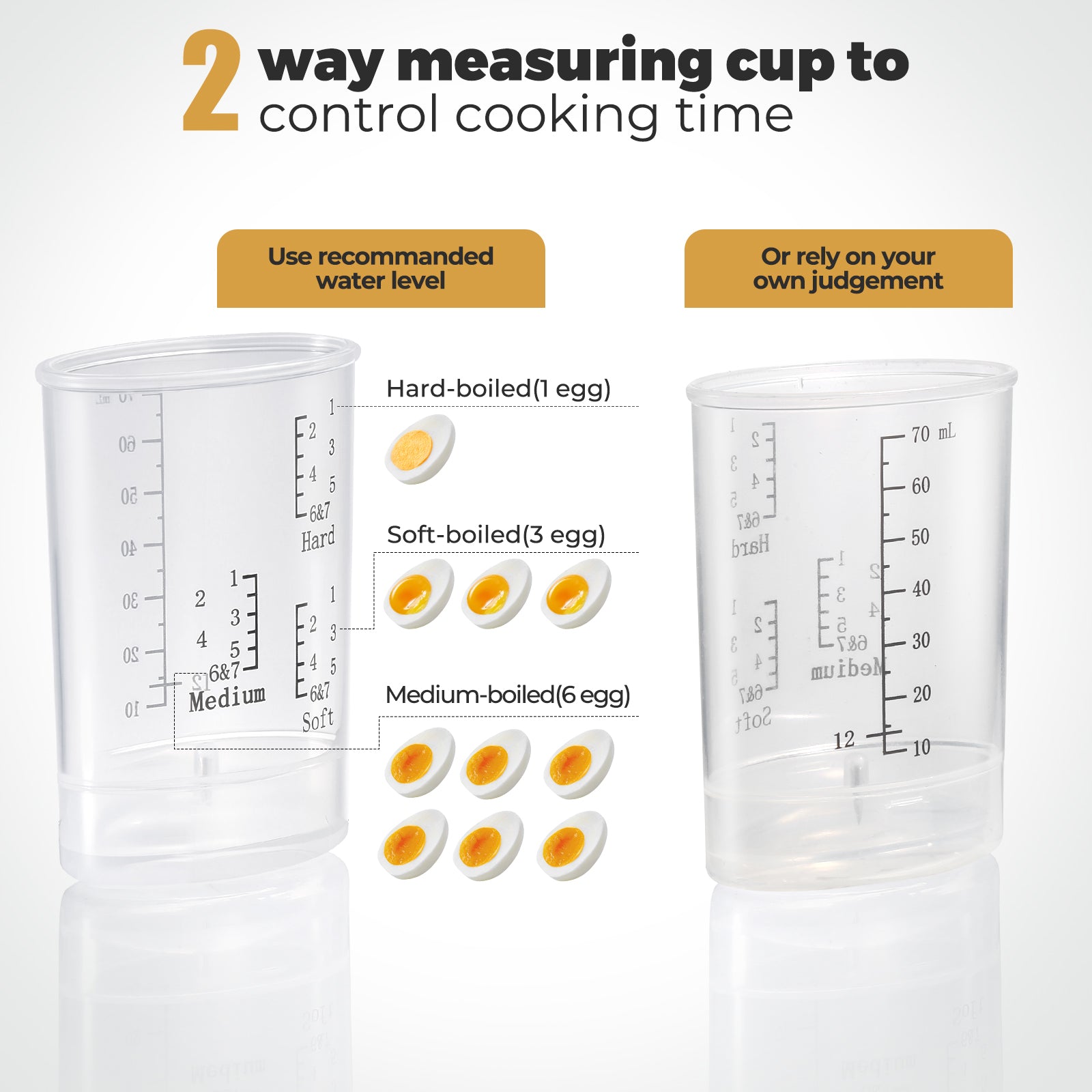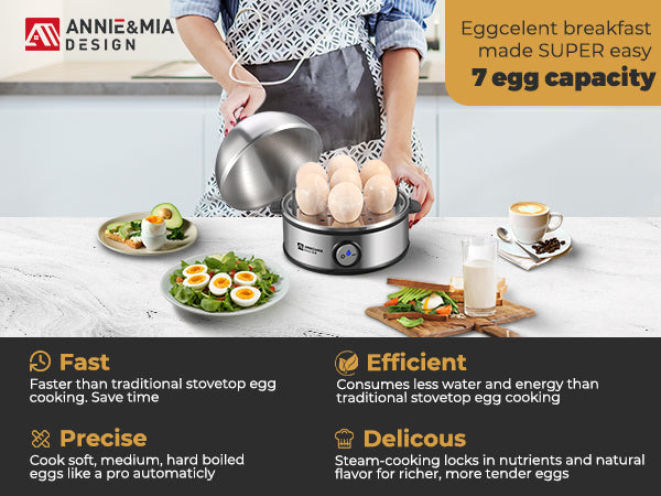 - COOK UP TO SEVEN EGGS SIMULTANEOUSLY: Streamline your mornings by preparing up to 7 eggs at a time with Annie & Mia Design egg boiler, cooked to your desired softness or firmness. The powerful 360-watt PTC heater steams up to seven eggs to soft, medium, or hard in 5–13 minutes with auto shut-off for worry-free results. NO timer is needed. Save time and energy compared to traditional stovetop methods.